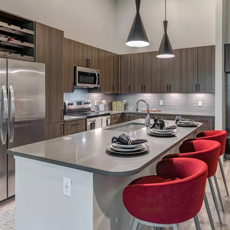 Our Kitchen Island FF&E Solutions redefine luxury residential design by seamlessly blending exquisite style with unparalleled functionality. Discover the perfect fusion of modern elegance and everyday convenience with meticulously crafted features including sophisticated, dark wood cabinets, stunning grey quartz countertops, and statement-making red velvet counter stools. With integrated wine storage, high-end stainless steel appliances, and sleek, modern lighting, our turnkey solutions create a cohesive and sophisticated culinary haven, optimizing both beauty and efficiency for today’s discerning homeowner.